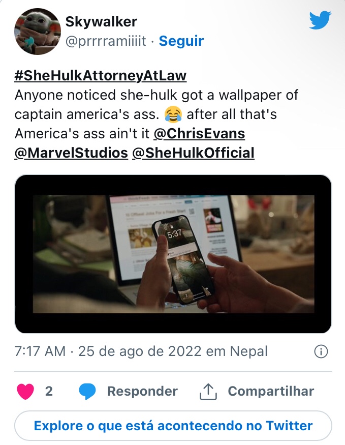 Nesta mesma cena, há outros dois easter eggs que valem ser mencionados. O primeiro é um callback à cena pós-créditos do primeiro episódio de She-Hulk, em que Jen lamenta que Steve Rogers (Chris Evans) e sua bela bunda da América supostamente nunca experimentaram sexo. Talvez por celebrar a notícia de que o herói não morreu virgem, ou simplesmente por ser grande admiradora, o plano de fundo do celular dela é, digamos, uma foto do Cap de costas…